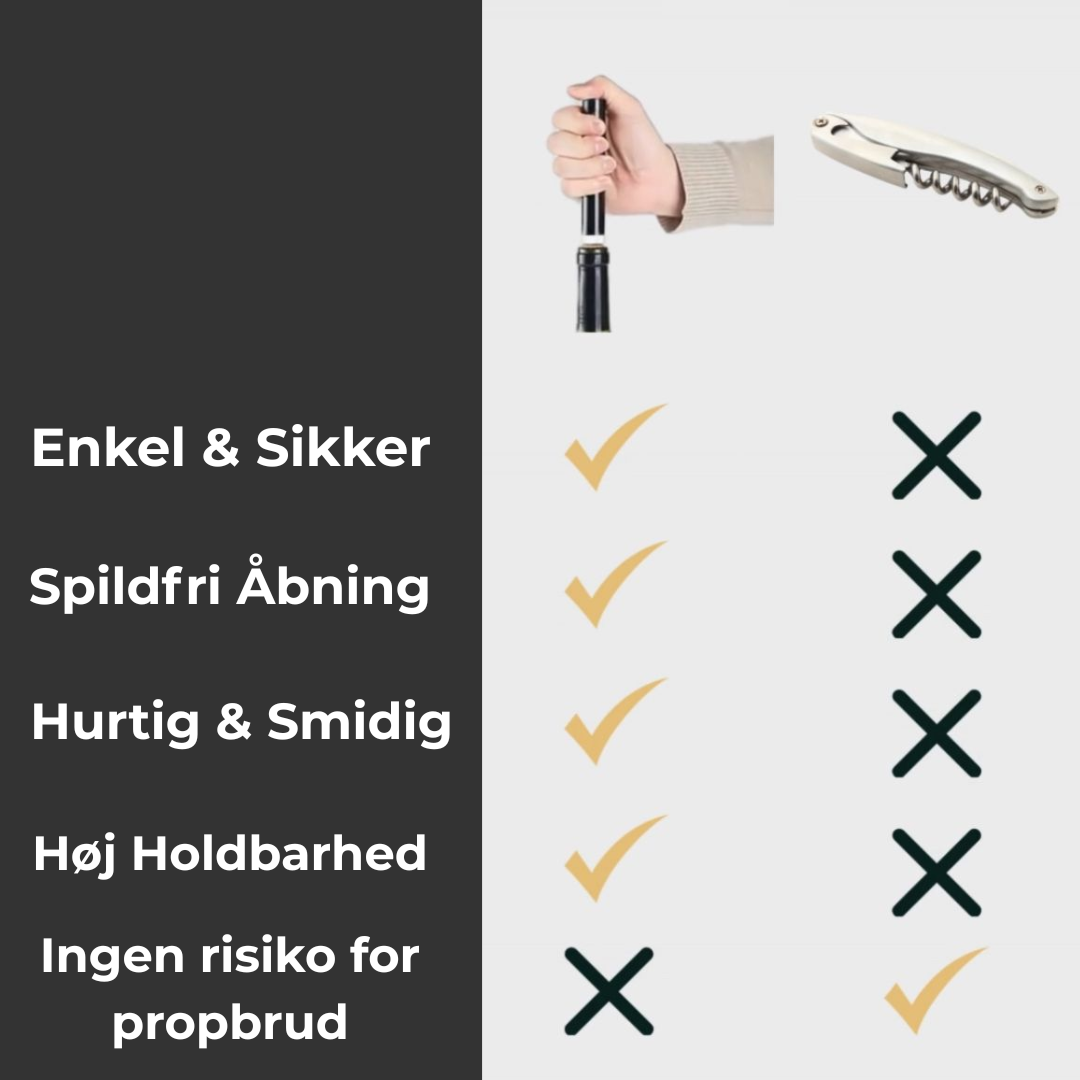 Med vores lufttryksdrevne vinåbner slipper du helt for stressen. Et enkelt tryk, og proppen løftes blidt ud af flasken.